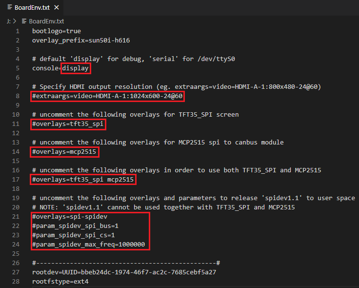 After the OS writes to the SD card, there is a FAT32 partition named BOOT, open BoardEnv.txt file with Notpad, Notpad++ or VSCode.
