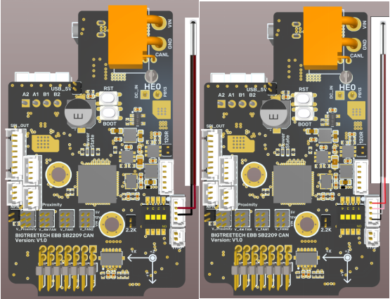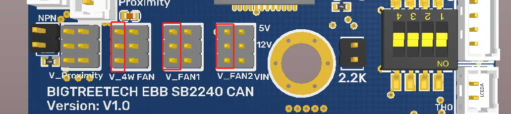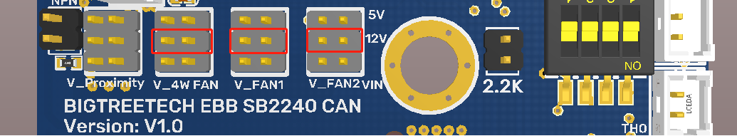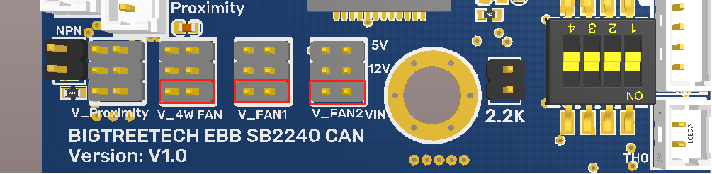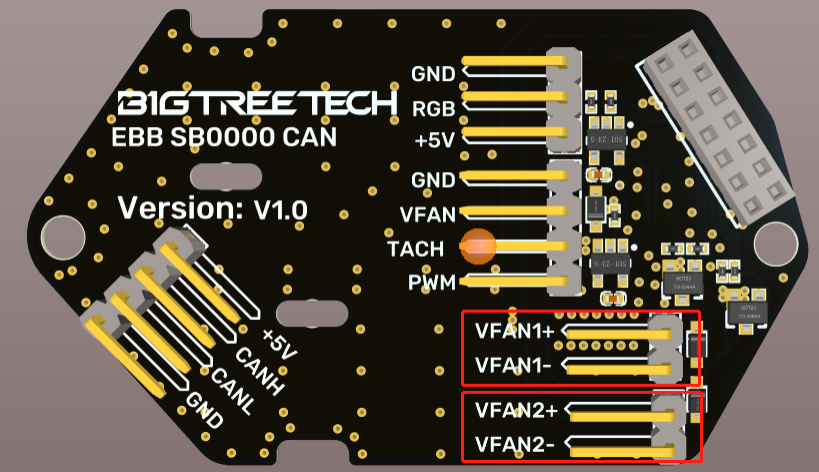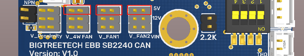 BIGTREETECH EBB SB2240/2209 CAN has built-in 2-way NC fan and 1-way 4-wire fan. Each fan can select different voltage (VIN/12V/5V) through jumper cap to adapt to fans with different working voltage.