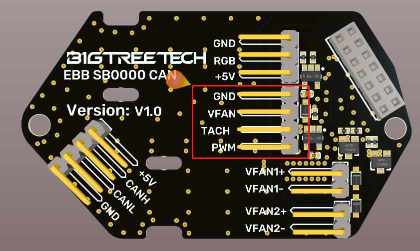 One 4-wire fan interface on the board can be connected to the 4-wire fan through the 4-wire fan interface on the BIGTREETECH EBB SB0000 CAN board.