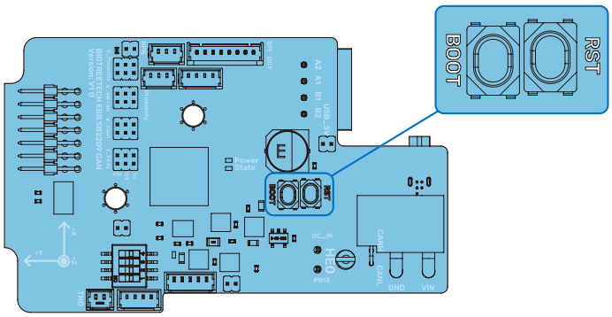 Press and hold the on-board BOOT key to power on the main board, or press the BOOT key and then press the RST key. The chip enters DFU mode. At this time, you can connect TYPE C to the PC and program the main control chip through DFU mode.