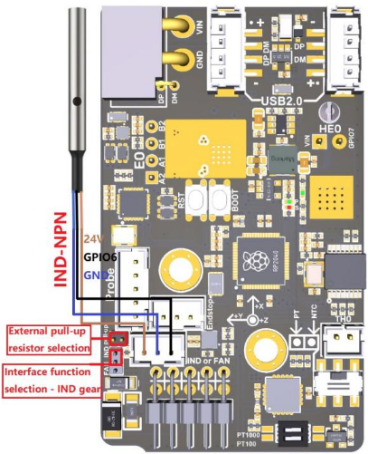 If using an NPN type proximity switch, use a jumper to short the two pins at the "pull-up" position.