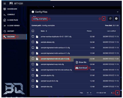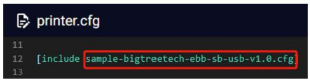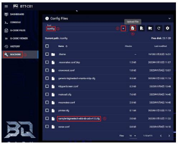 1、Access the mainsail web UI by entering the IP address of the Raspberry Pi into your browser. Using the path shown in the image below, download the reference configuration named sample-bigtreetech-ebb-sb-usb-v1.0.cfg. If this file is not found, update the Klipper firmware source code to the latest version or use the link to download it from GitHub: