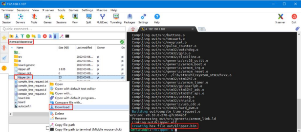 3.Enter make to compile the firmware. The 'klipper.bin' firmware that we need will be generated on the home/pi/klipper/out folder of the Raspberry Pi when completed. The firmware is on the left side of SSH software, users can download it directly to the computer.