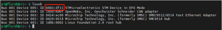 lsusbin the ssh terminal command line to query the ID of the DFU device.