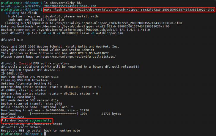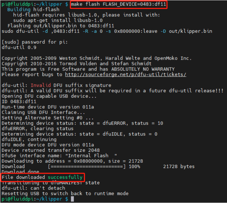 make flash FLASH_DEVICE=0483:df11to download the firmware (Notice: Replace 0483:df11 with the actual ID of the DFU device queried in the previous step).