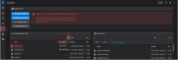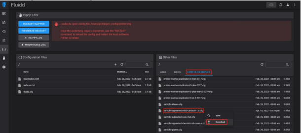 1.Enter the IP access of Raspberry Pi in the browser of the computer, and download the reference configuration of the motherboard from the file path shown in the figure below. If you cannot find this file, please update the Klipper firmware source code to the latest version, or download it from GitHub: https://github.com/bigtreetech/EBB