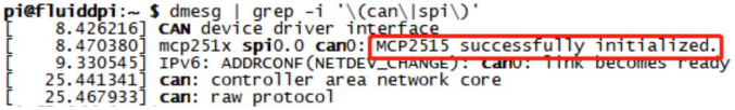2.Type and run commands dmesg | grep -i '\(can\|spi\)' to test if RPI-CAN HAT module is normally connected. The normal response should be as below: