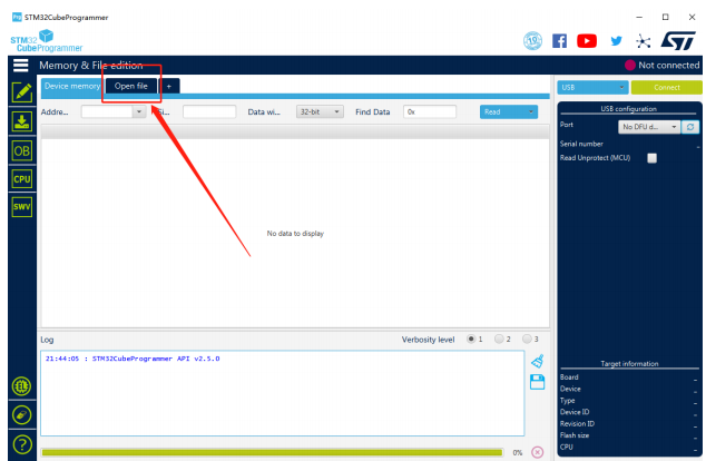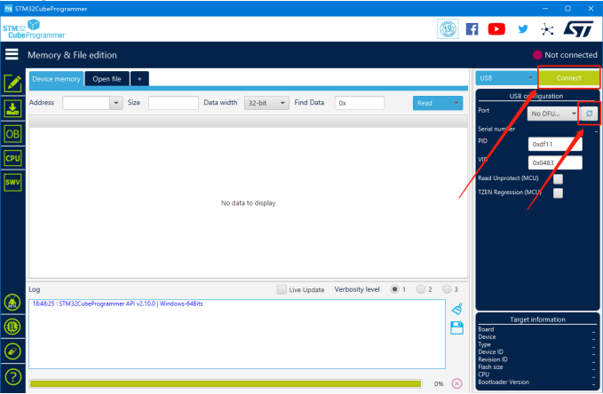 3.Click the "Refresh" button in the STM32CubeProgrammer until the Port changes from "No DFU d..." to "USB1", then click "Connect" to connect the chip.