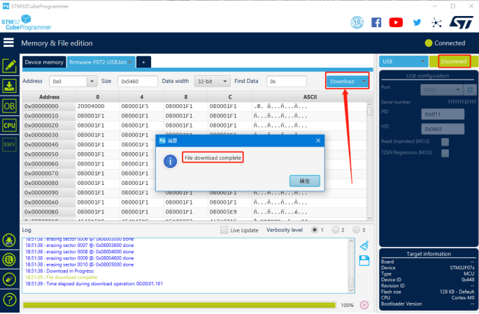 4.After the connection is successful, "Connect" will change into "Disconnect", and then click "Download", after the download is completed, a pop-up window of "File download complete" will appear, indicating that the burning is successful.
