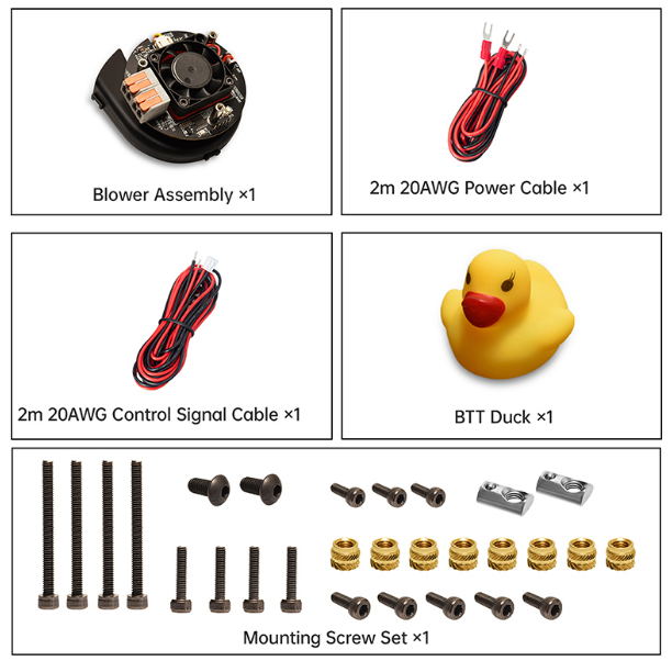 The BIQU Eco Turbo Kit is designed to significantly boost cooling efficiency. This kit supports a wide voltage range of 5-24V, allowing for the direct replacement of standard DC fans. It features quick-connect terminals and pre-crimped wires for hassle-free installation. Additionally, it is equipped with a driver cooling fan to ensure stable operation of the blower.