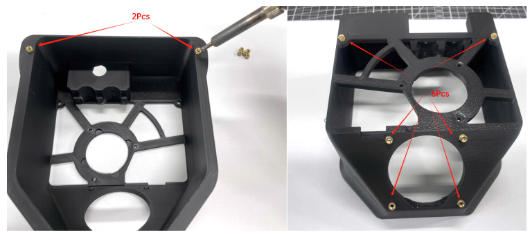 - Melt eight M3 heat-set inserts into the printed case, ensuring they sit flush with the case surface. (front side of the shell: 2 pcs, other side of the shell: 6 pcs)