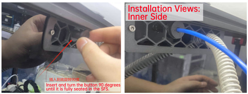 - Insert the SFS quick-connect button and turn it 90 degrees, then insert the PTFE tube into the button until it is fully seated in the SFS.