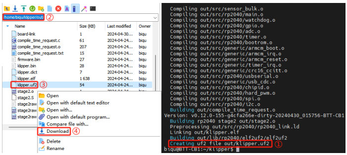 5.Enter make to compile the firmware. When make is completed, the required klipper.uf2 firmware will be generated in the home/pi/klipper/out folder and can be directly downloaded to the computer on the left side of the SSH software.