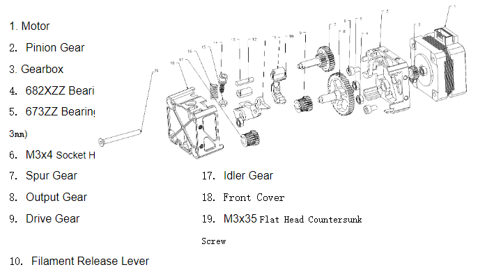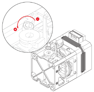 The tension of the drive gear is adjustable to allow for the use of various types of filament. Turn the Tensioner Screw counterclockwise to increase pressure or clockwise to decrease pressure.