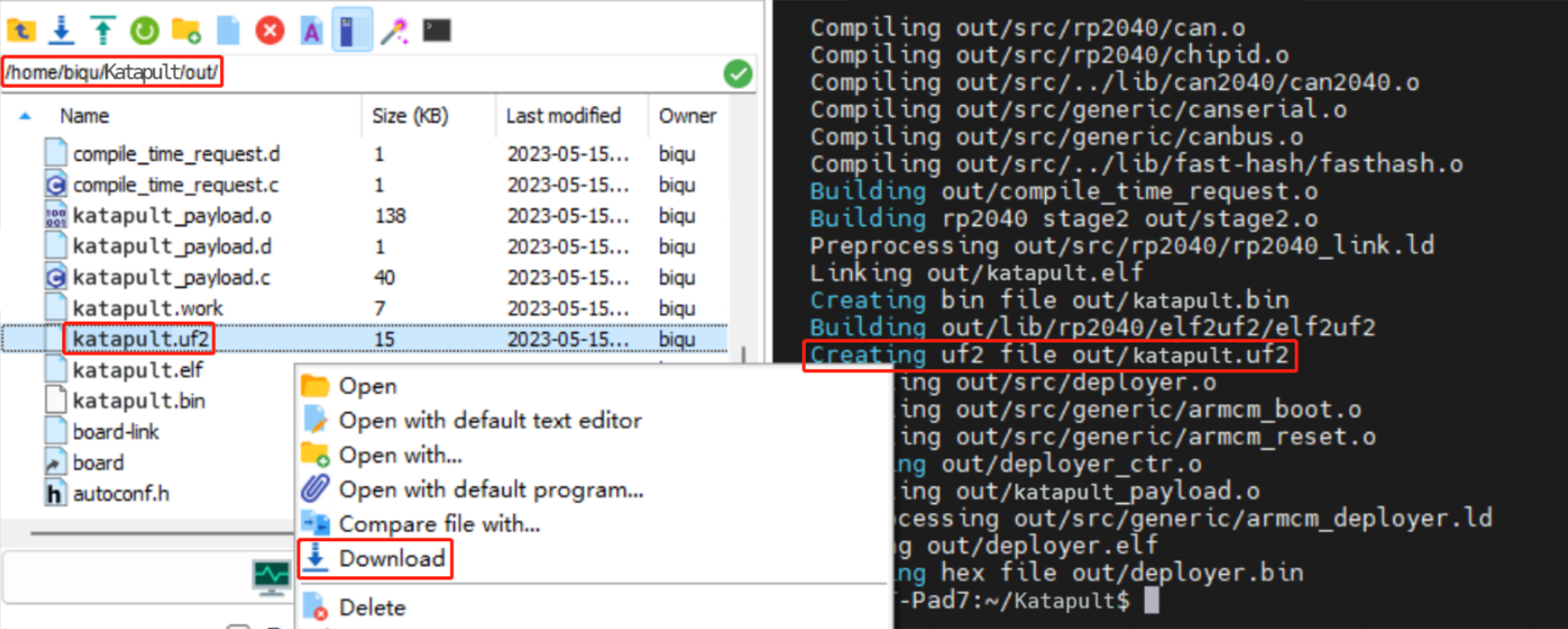 3、Enter make to compile the firmware. When make is completed, the required katapult.uf2 firmware will be generated in the home/biqu/Katapult/out folder and can be directly downloaded to the computer on the left side of the SSH software.