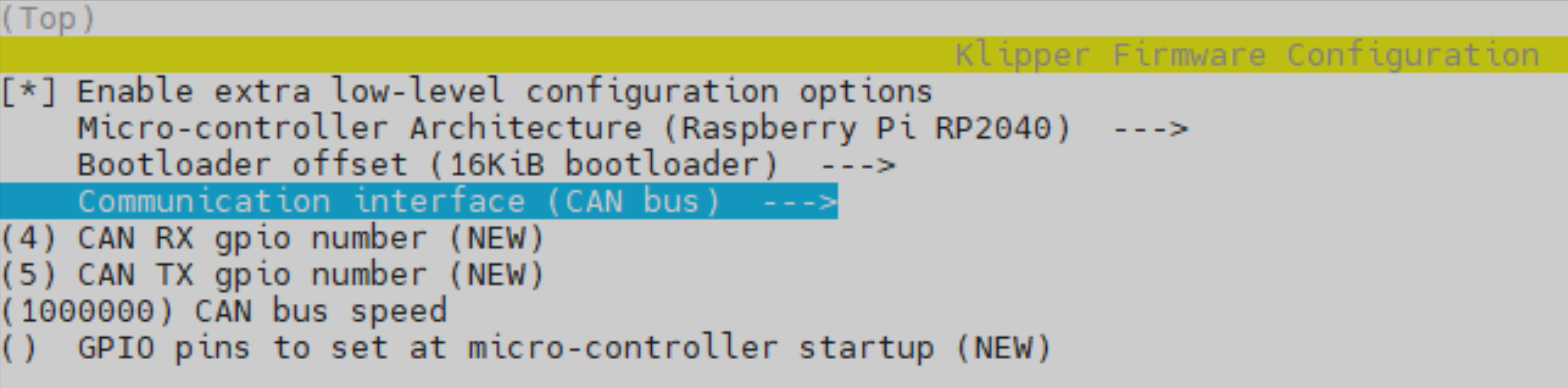 Compile the firmware using the configuration below (if these options are not available, update the Klipper firmware source code to the latest version).