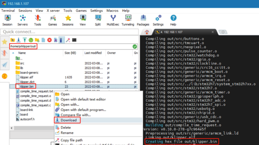 3、Enter make to compile the firmware. When make is completed, the required klipper.bin firmware will be generated in the home/pi/klipper/out folder and can be directly downloaded to the computer on the left side of the SSH software.