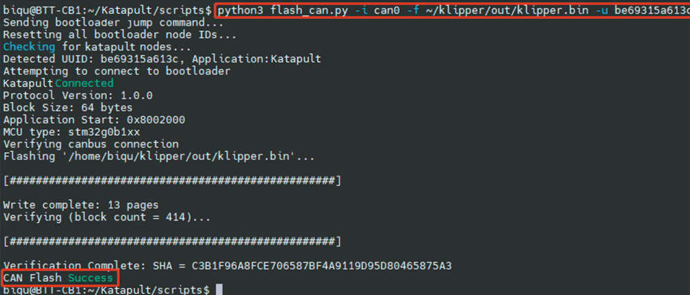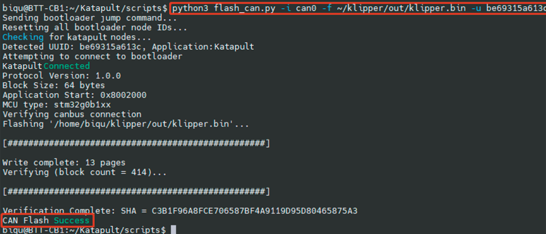 replacing the UUID parameter after "-u" with the actual UUID on your board. Note: by this point, you should have already compiled klipper.bin using "make". Additionally, when selecting the bootloader offset in the Klipper menuconfig, use the 16KiB option since Katapult's Application start offset is 16KiB. The image below shows a successful flashing sequence.