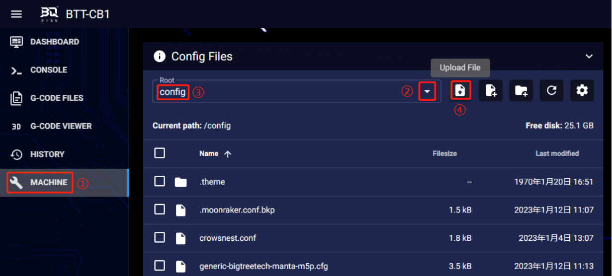 1、Access the mainsail web UI by entering the IP address of the BTT Pi or Raspberry Pi into the browser. Using the path shown in the image below, download the reference configuration named sample-bigtreetech-hermit-crab-2-canbus.cfg. If this file is not found, update the Klipper firmware source code to the latest version or use the link to download it from
