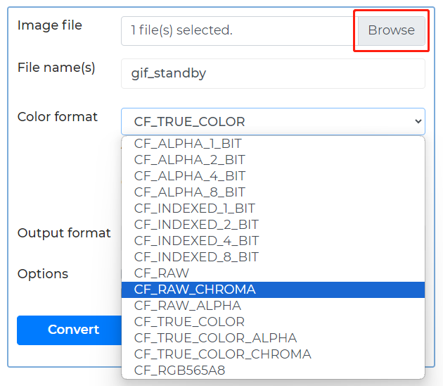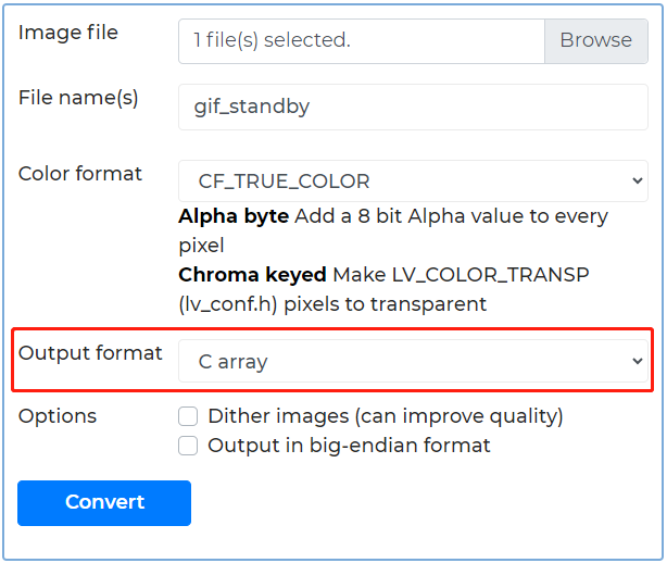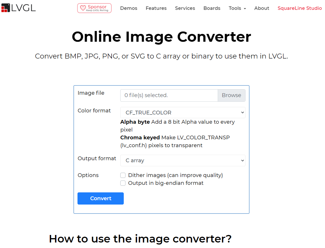 Click on the link to enter the GIF conversion tool https://lvgl.io/tools/imageconverter