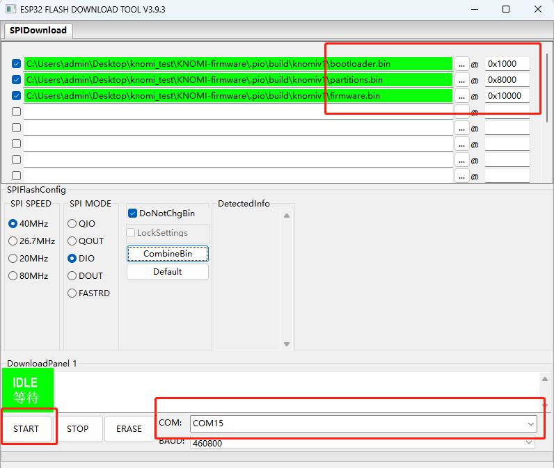 ...to add 3 corresponding bin files, and manually enter the corresponding bin file offset address after@(note that the bin file name corresponds to the address). Select COM for knomi1. ClickSTARTto start downloading, wait for the progress bar to end and prompt completion;