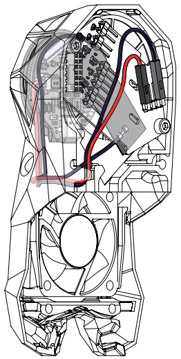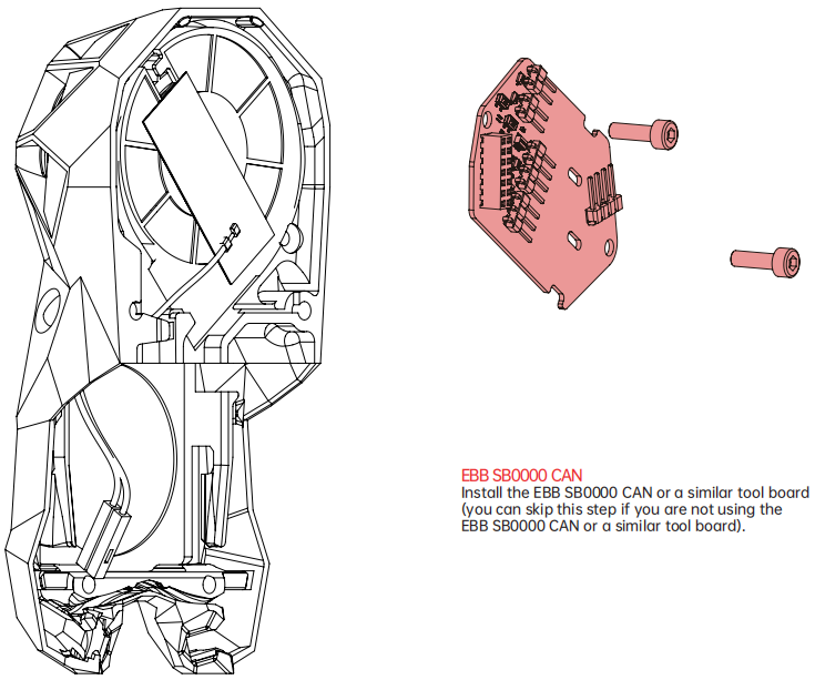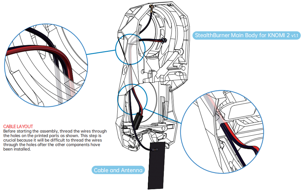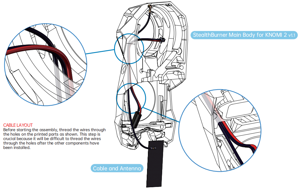 As shown, guide KNOMI 2's power cable through the hole in the printed part, and then direct it towards the rear of the EBB SB0000 CAN.