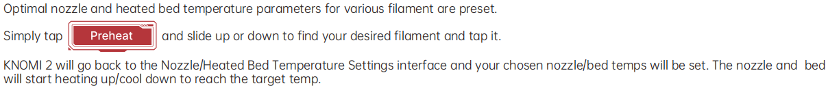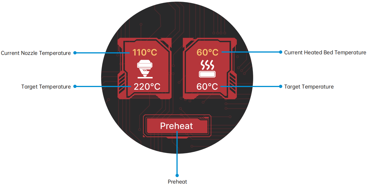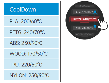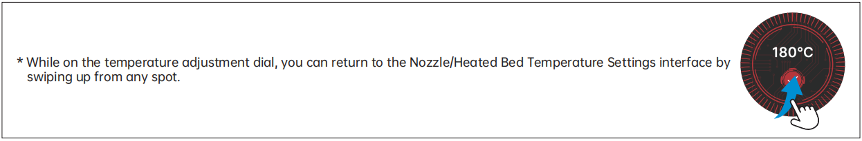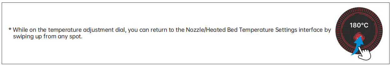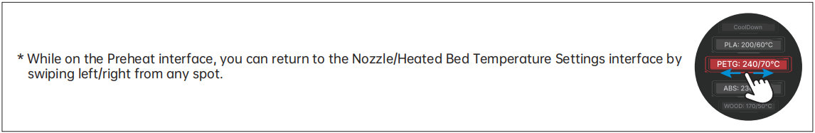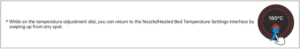 Swipe left from the Standby UI to access the Nozzle/Heated Bed Temperature Settings interface.