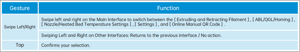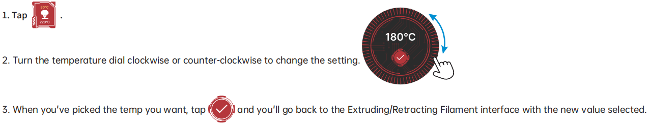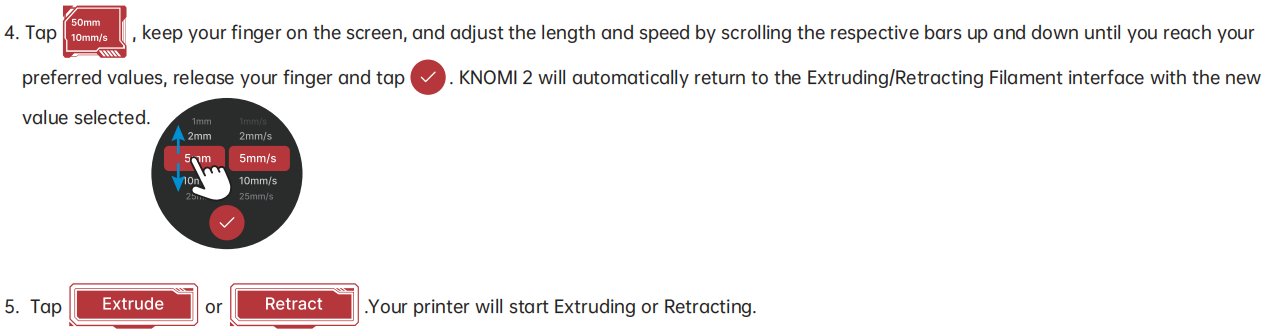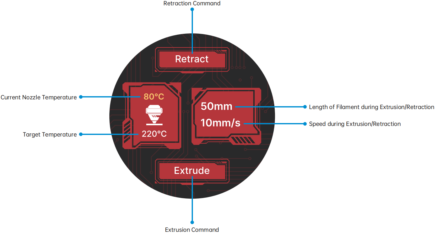 Swipe right from the Standby UI to access the Extruding/Retracting Filament interface.
