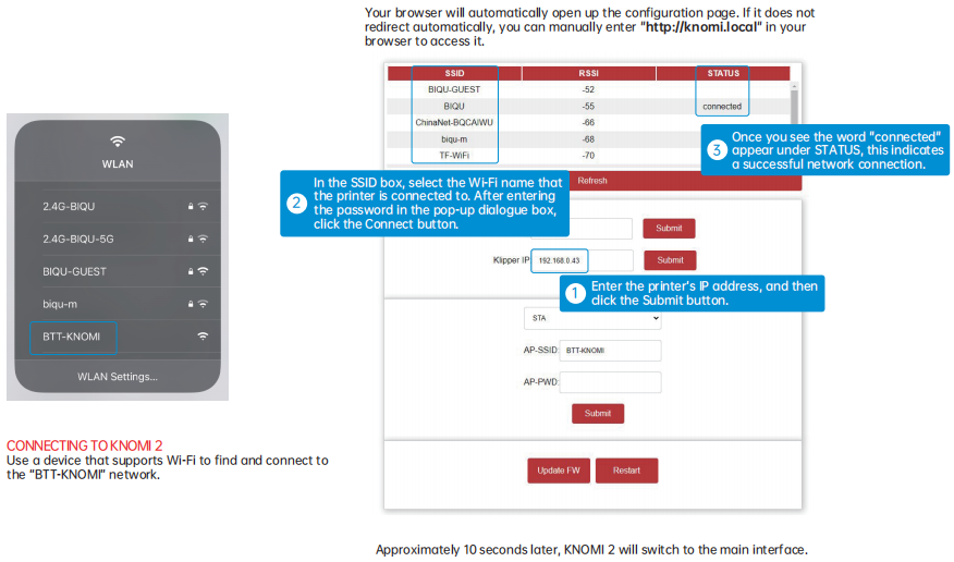 Enter http://knomi.local into your browser to access the KNOMI 2 network configuration page. Scroll to the bottom of the page and click Update FW.