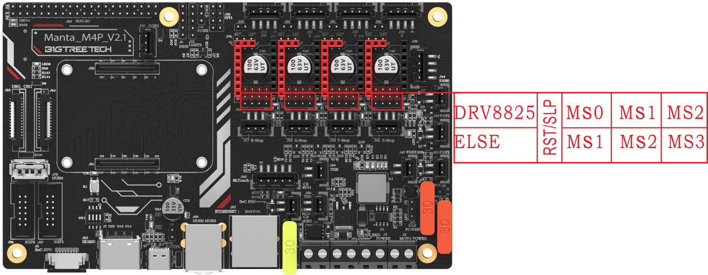 For example, TMC2208, TMC2209, TMC2225... Use a jumper cap for each to connect the position of the red box in the figure, and the subdivision and driver current is set by firmware.