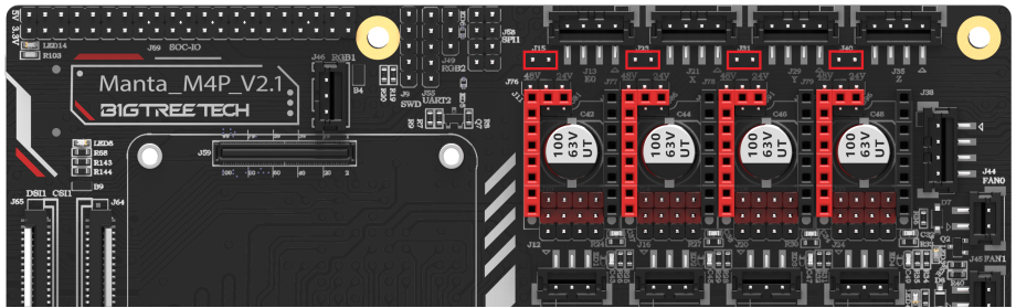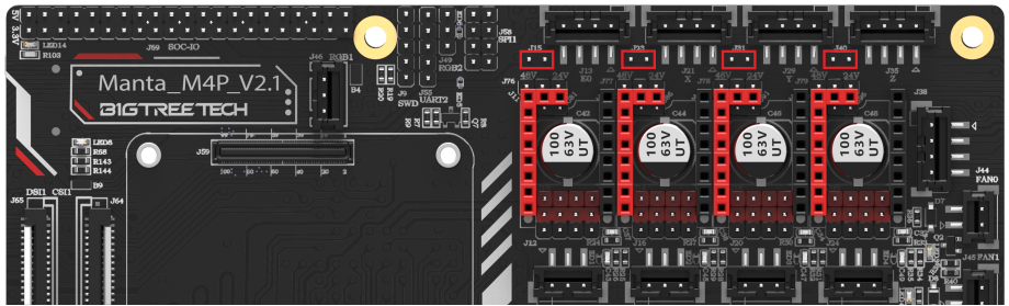The power supply of each driver can be set by the jumper. When the jumper is inserted into the left side, the independent MOTOR POWER port is used for driver power, and the supported voltage up to 56V. When the jumper is inserted into the right side, the main POWER port is used for driver power, and the 12/24v voltage is supported.