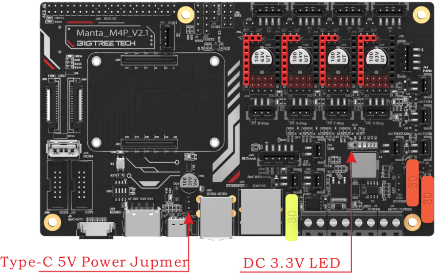 After the M4P is powered on, the red LED1 on the lower right side of the motherboard will light up, indicating that the power supply is normal. The J8 on the middle of the board is the power selection terminal, it needs to be short circuited only when the type-C USB is used to supply power to the