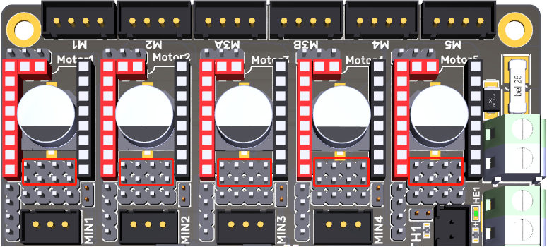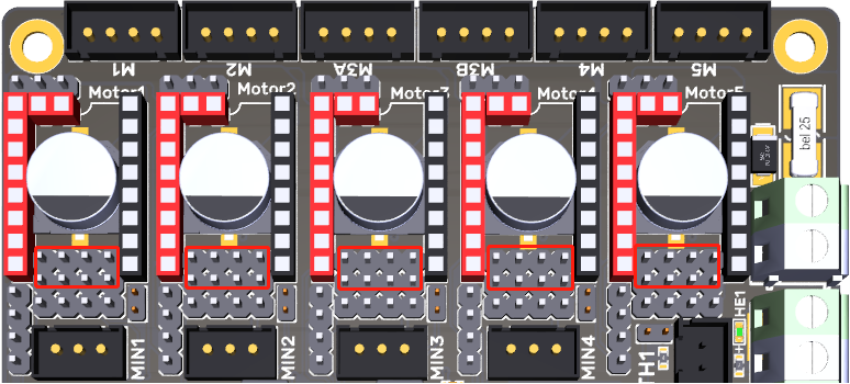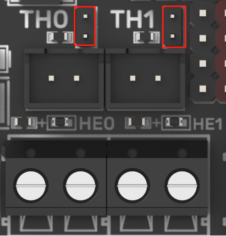 When using 100K NTC, no jumpers need to be connected, the pull up resistance of TH0-TH3 is 4.7K 0.1%. When using PT1000, the pins indicated in the picture below need to be connected via jumpers, parallel connection of 4.12K 0.1% resistors, the pull-up resistance of TH0-TH1 is 2.2K. (This method has a much lower accuracy than the MAX31865 in reading temperature.)
