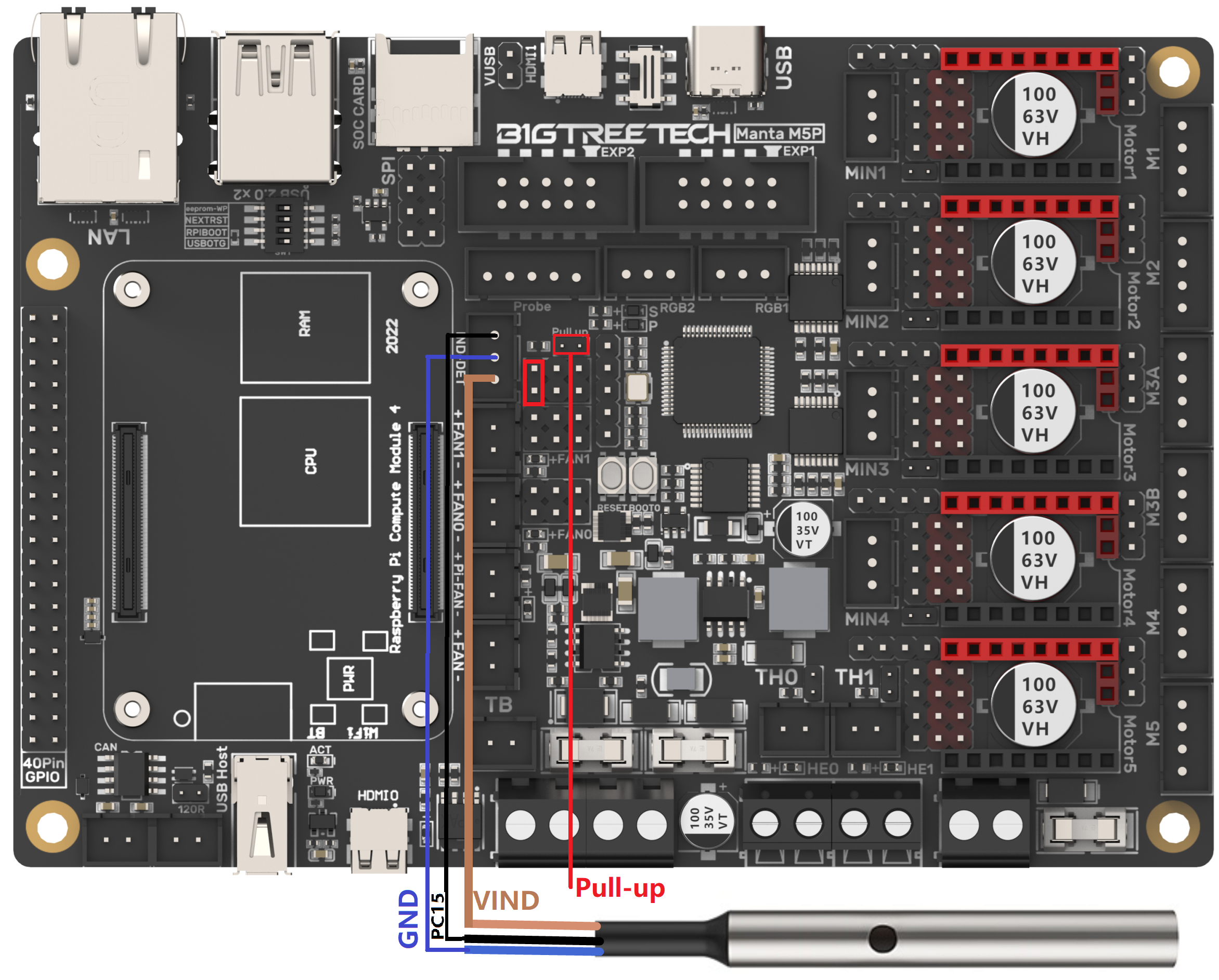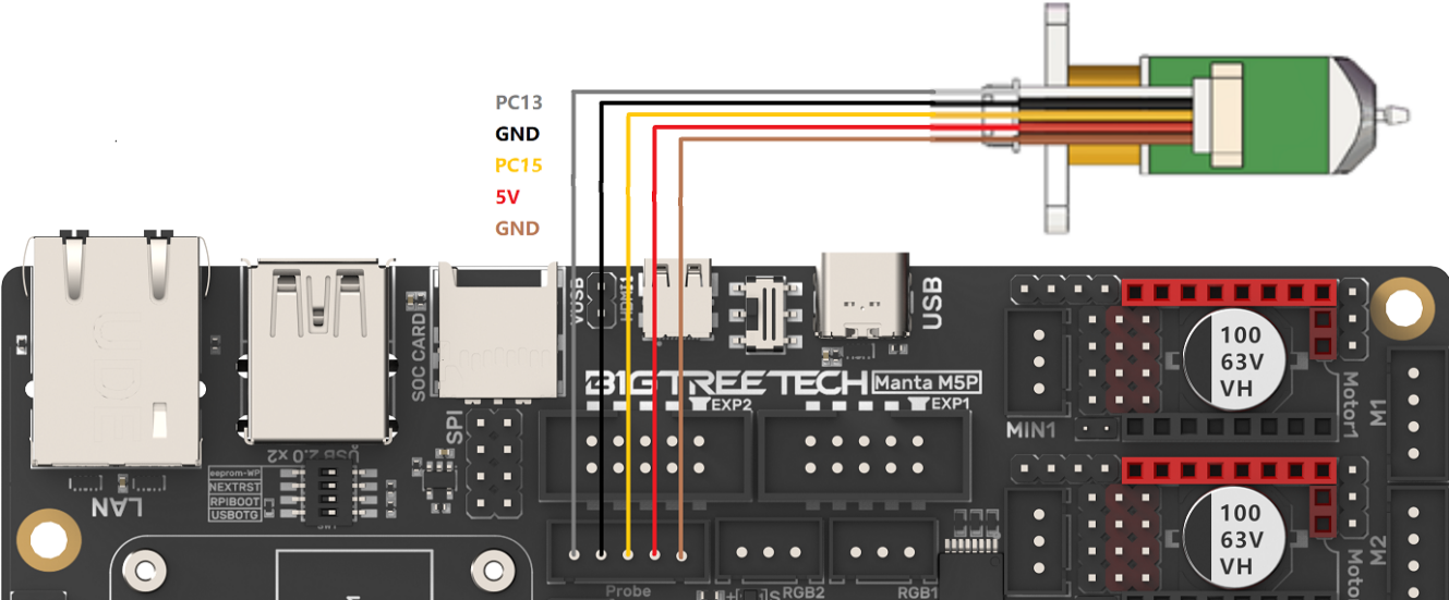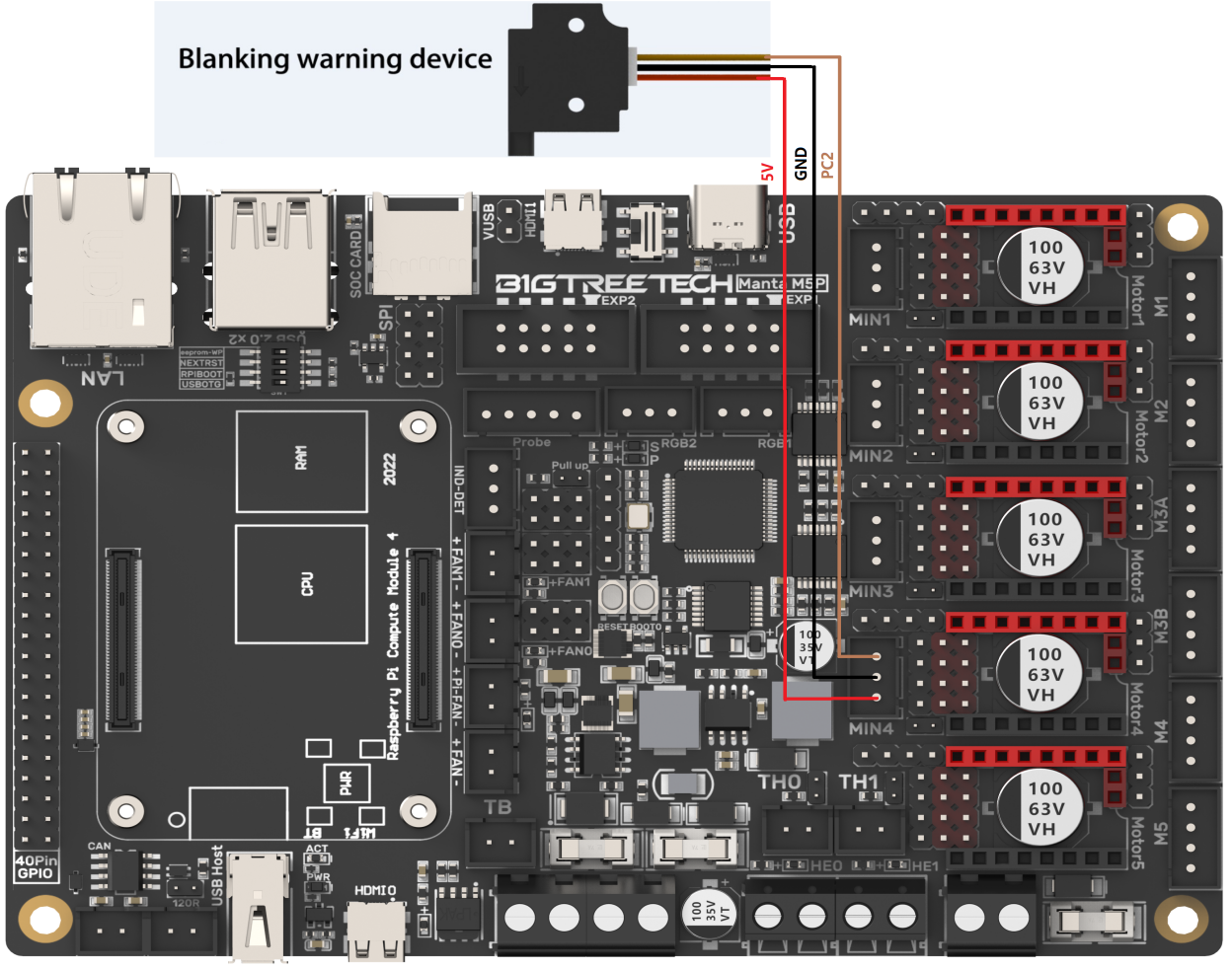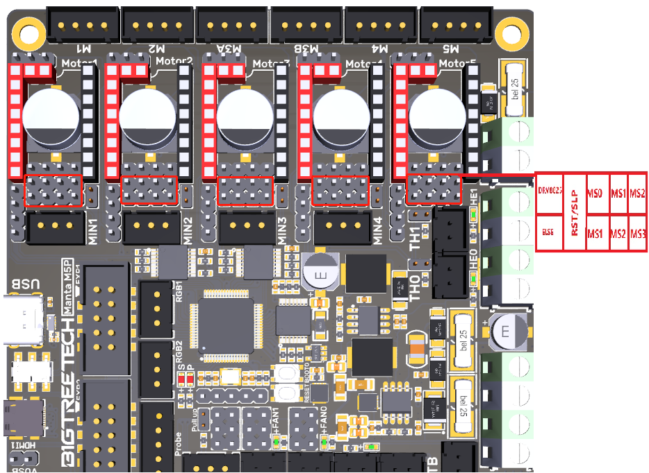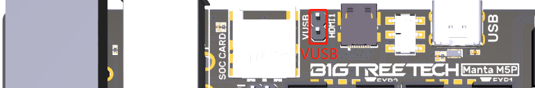 After the BIGTREETECH MANTA M5P has been powered, the red light D22 on the left side of the MCU will light up, indicating power on. When using only the USB to power the board or provide power through the USB, please insert the jumper cap onto the VUSB.