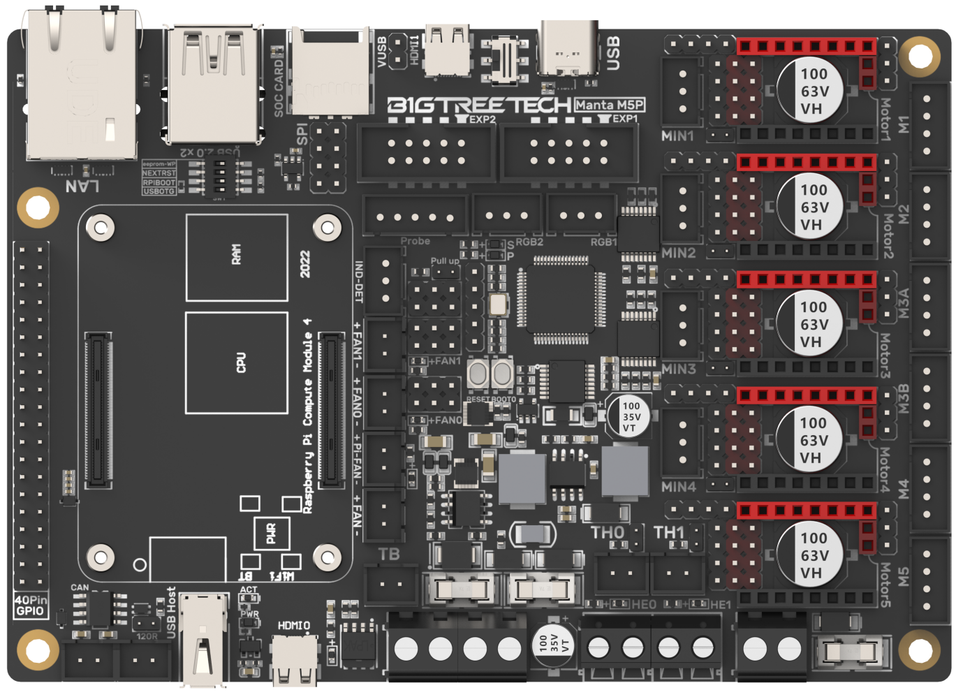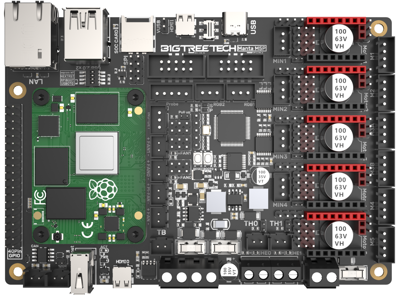 BIGTREETECH MANTA M5P is a 32-bit motherboard developed by the 3D printing team of Shenzhen BIQU Innovation Technology Co., Ltd. for Klipper running. It can run Klipper with a core board, which greatly eliminates the mass wiring between the motherboard and Raspberry Pi, and also greatly saves space in the chassis. The BTB headers are designed on MANTA M5P, so that customers can choose to use CM4 or other solutions, thus solving the insane shortage of Raspberry Pi CM4.