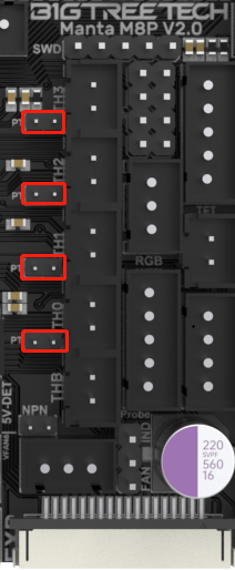 For 100K NTC thermistors, no jumper is needed. At this time, the pull-up resistor of TH0-TH3 is 4.7K 0.1%. For PT1000, short the pins in the red box to add 4.12K 0.1% in parallel, at this time, the pull-up resistor of TH0-TH1 is 2.2K.