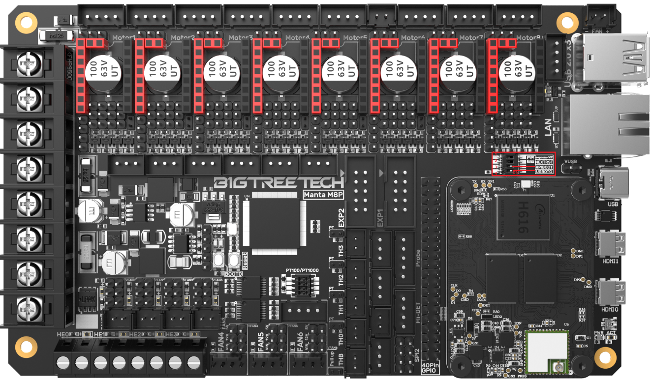 - The MCU firmware can be upgraded through an SD card or through the "make flash" command in Klipper to update the MCU firmware via DFU.