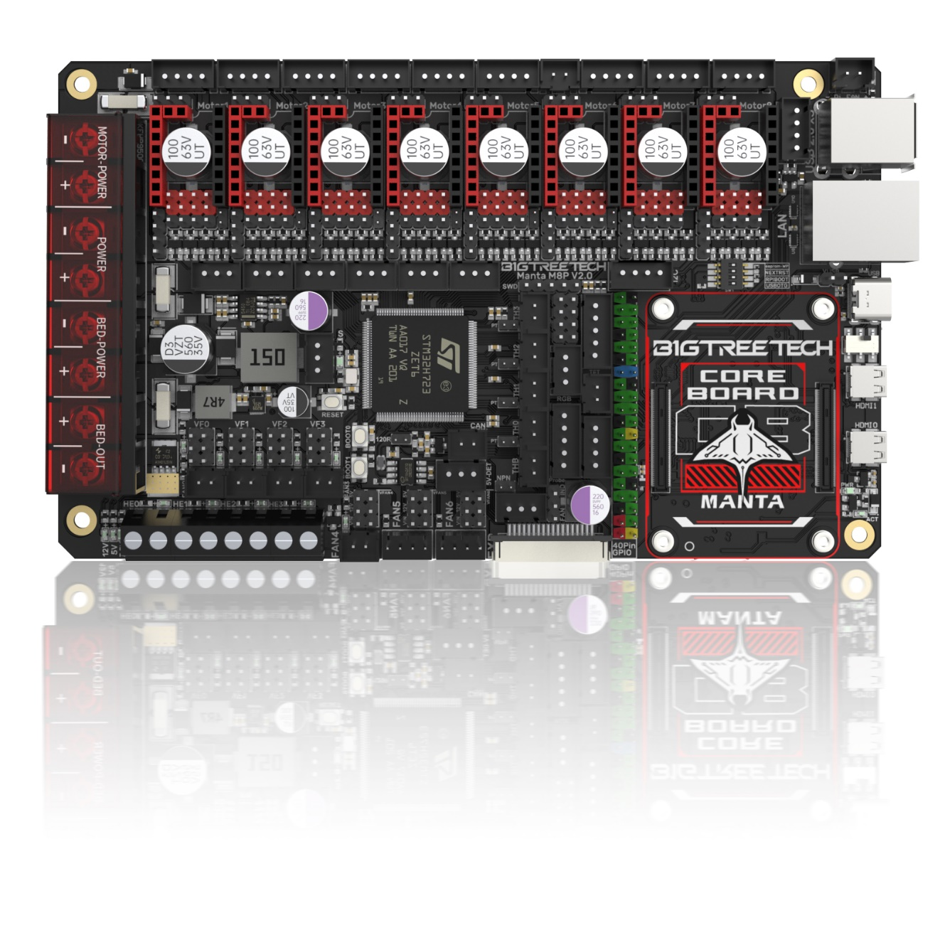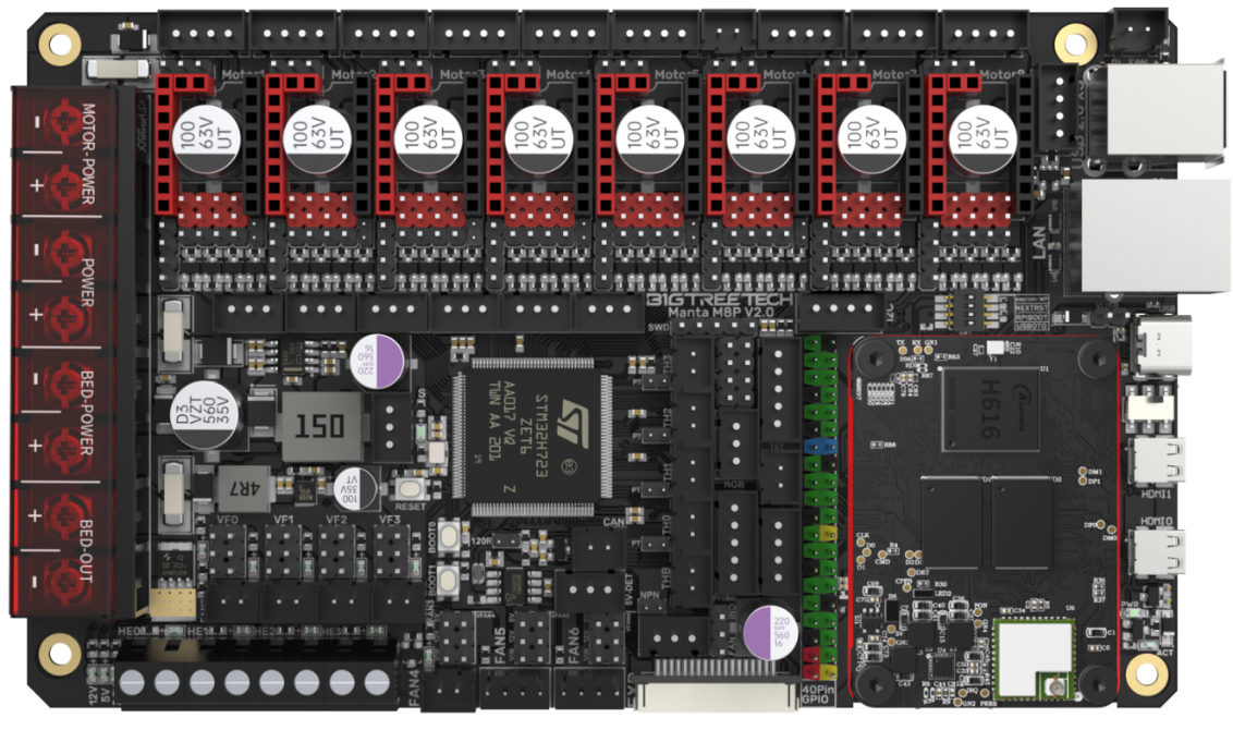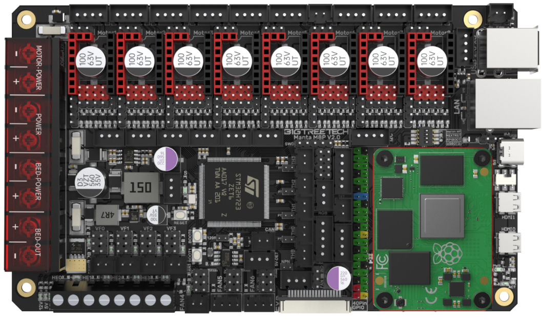 BIGTREETECH Manta M8P V2.0 is a 32-bit 3D printer control board designed for use with Klipper firmware. It allows direct installation of a core board to run Klipper, greatly simplifying connections to a Raspberry Pi and saving space in the electronics enclosure. The board has a BTB socket for use with a CM4, CB1, or other solutions, providing flexibility beyond the expensive CM4.