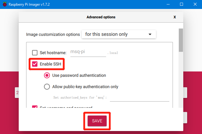 5、"Enable SSH" and then click "Save", there are other functions that can be set in this interface, please modify them according to your needs. Details are as follows: Set hostname: raspberrypi.local // custom hostname, default is raspberrypi.local Enable SSH Set username and password // custom username and password, default username: pi, password: raspberry Configure wireless LAN // custom WiFi name and password