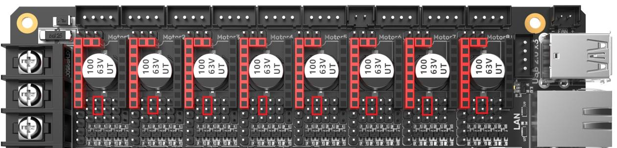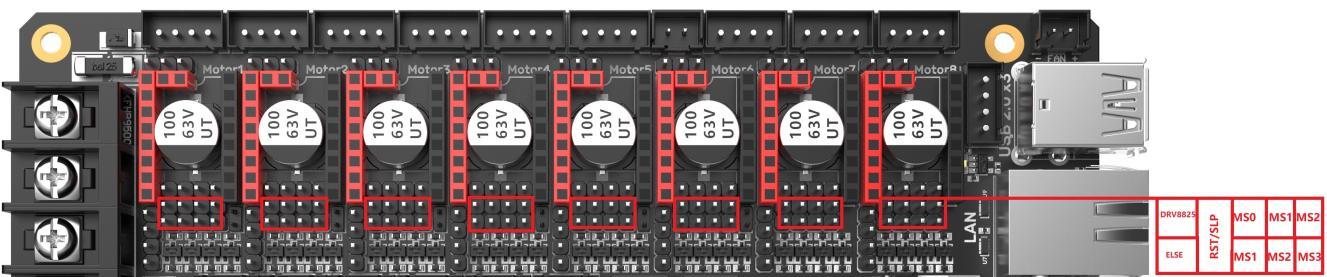 For example, TMC2130, TMC5160, TMC5161, etc. Each uses four jumpers to short the red box positions in the diagram. Micro-stepping and drive current are set through the firmware.