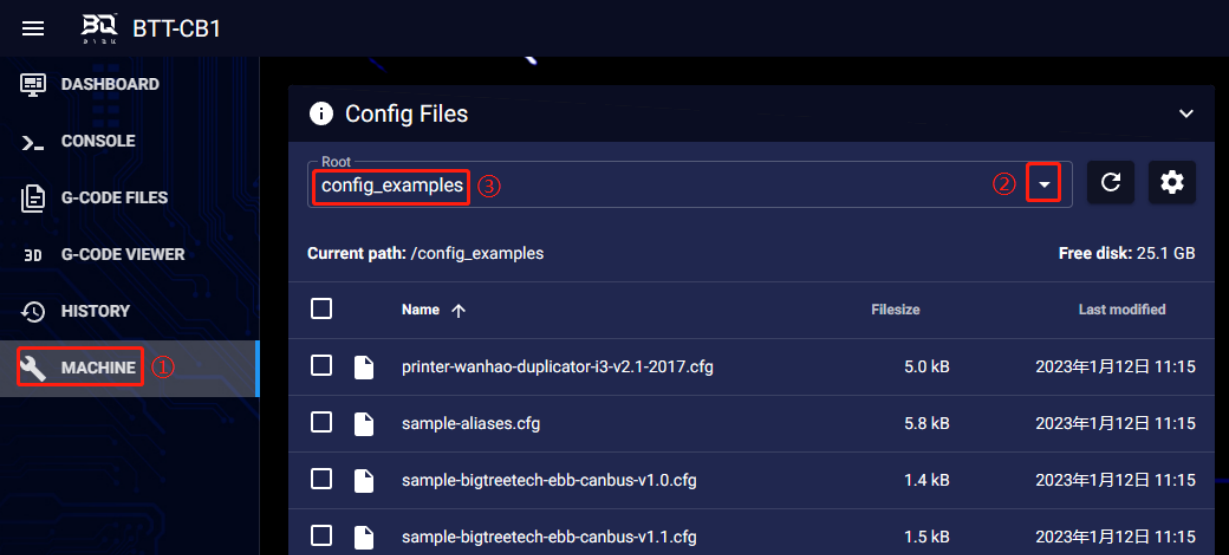 1、Enter the Raspberry Pi's IP address in the computer's browser to access it. Download the reference configuration named generic-bigtreetech-manta-m8p-V2_0.cfg in the path shown in the image below. If you cannot find this file, please update the Klipper firmware source code to the latest version or download it from GitHub: