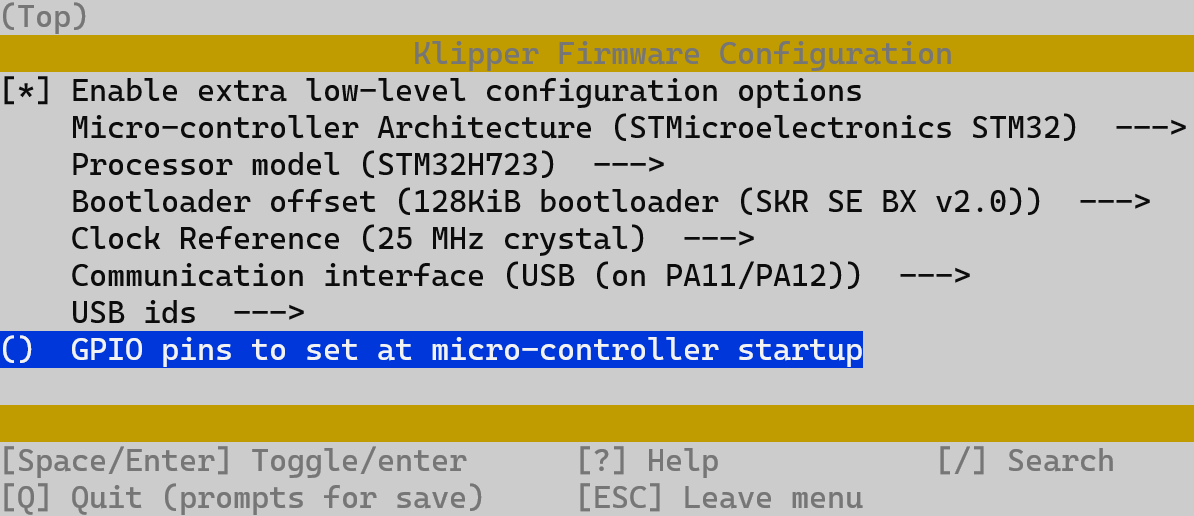 Use the following configuration to compile the firmware (if the options below are not available, please update the Klipper firmware source code to the latest version): * [*] Enable extra low-level configuration options * Micro-controller Architecture (STMicroelectronics STM32) ---> * Processor model (STM32H723) ---> * Bootloader offset (128KiB bootloader (SKR SE BX v2.0)) ---> * Clock Reference (25 MHz crystal) ---> * Communication interface (USB (on PA11/PA12)) --->