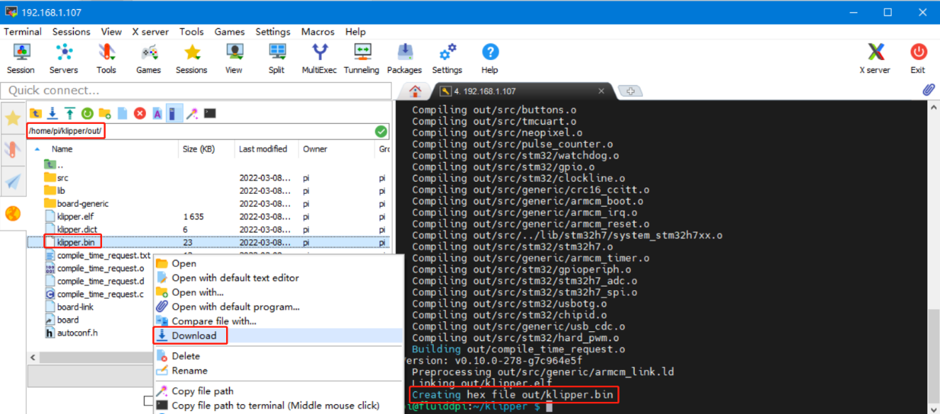 3、Enter make to compile the firmware. After the make command is executed, the klipper.bin firmware we need will be generated in the device's home/pi/klipper/out folder. You can download it directly to your computer using the SSH software.
