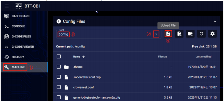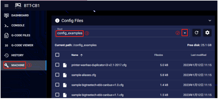 1、In your computer's web browser, enter the Raspberry Pi's IP address, and as shown in the path below, download the reference configuration file sample-bigtreetech-mmb-canbus.cfg. If the file is not available, update Klipper firmware to the latest version or download from: