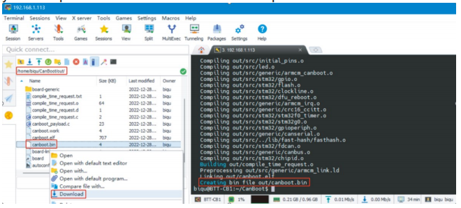 3.Enter make to compile the firmware. The resulting canboot.bin file will be in the home/biqu/CanBoot/out folder. This can be directly downloaded to your computer from the SSH software's left panel.