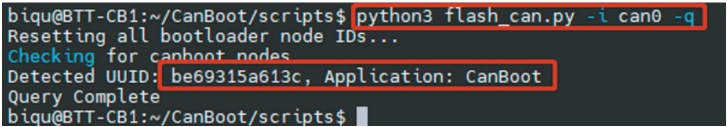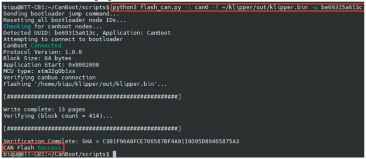 python3 flash_can.py -i can0 -f ~/klipper/out/klipper.bin -u be69315a613c