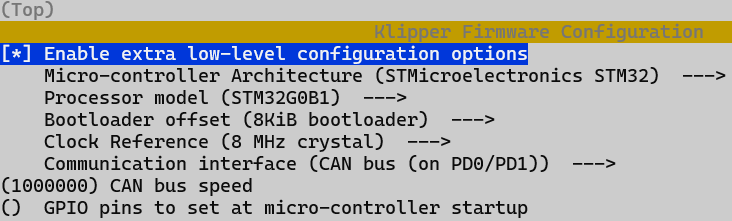 Compile the firmware using the configuration below (should these options not be available, update the Klipper firmware source code to the latest version).