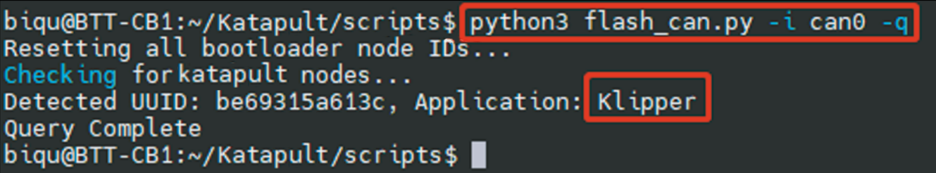 to query. At this stage, the “Application” has changed from Katapult to Klipper, indicating that Klipper is running normally.