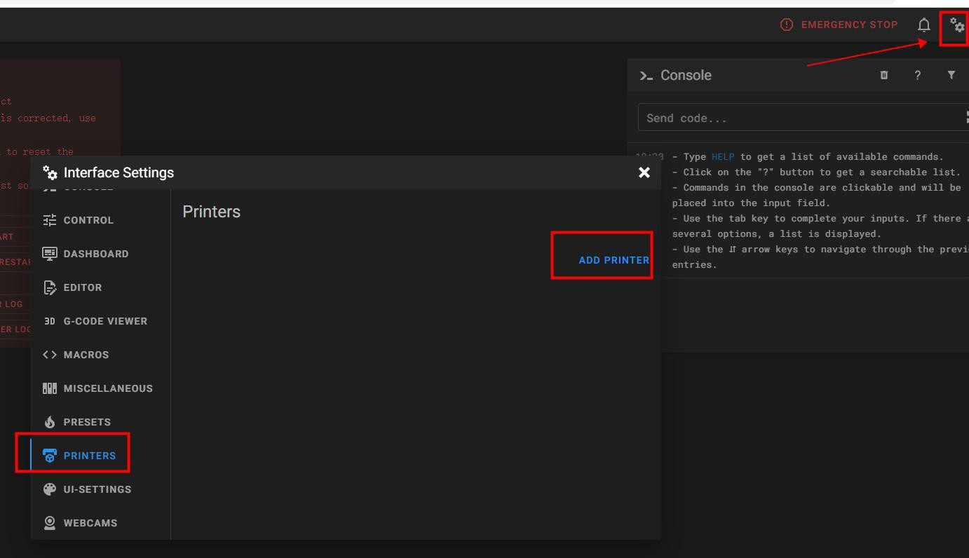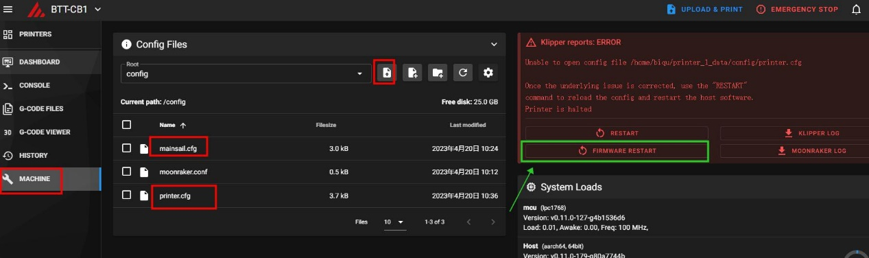 9.Add the corresponding configuration file for each of the three machines. For example, the Printer 1, click the blue command line (SWITCH TO PRINTER), then add the corresponding printer.cfg file (If there is no mainsail.cfg file, it is recommended to upload one as well. The [virtual_sdcard] path in this file might be different, and you can make adjustments based on the notification bell in the top right corner of the webpage.) in the MACHINE option, and then click FIRMWARE RESTART as shown in the figure: