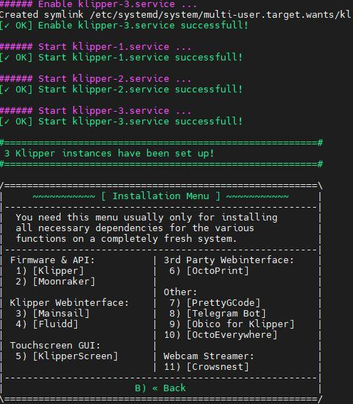 Send 1 again, select the Klipper version, and then prompt the number to be installed. If using 3 units, enter 3, press Enter, send y, and then name the three machines respectively. After the naming is complete, press Enter, it will enter the Klipper installation stage.